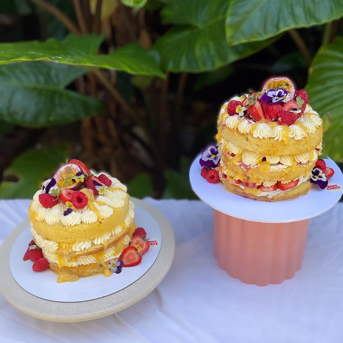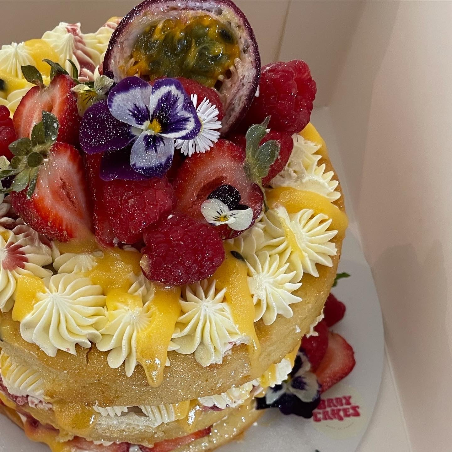 Baby cakes on the lighter side with fresh fruits, passionfruit curd & vanilla.,