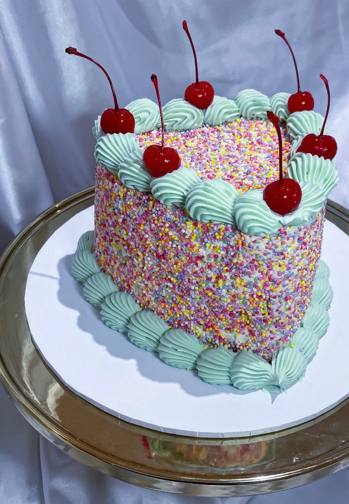 Your cake will be covered in sprinkles and THEN topped off with vintage piping (colour of your choice of course).